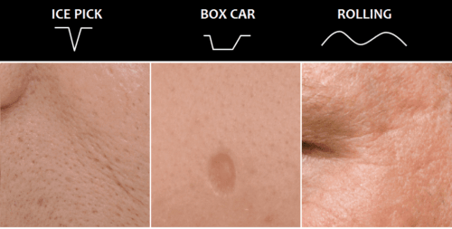 Las «boxs scars«, son aquellas que son como una depresión superficial o profunda. La superficial no pasa de los 0,5mm de diámetro. Pasada esa dimensión estaríamos hablando de cicatrices profundas. Suelen estar por las mejillas o zona de la sien.